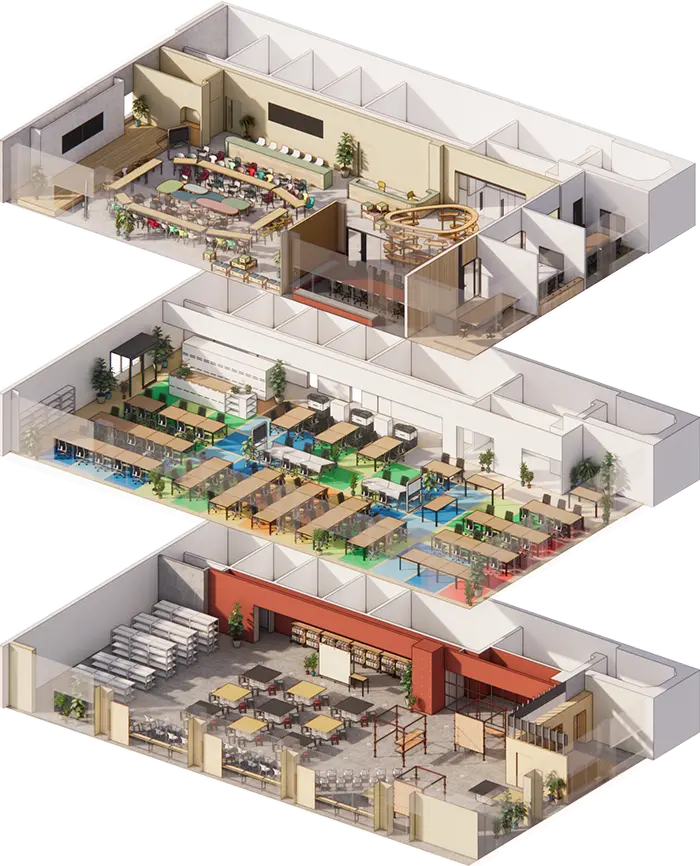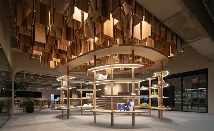 類設計室 東京設計室の6Fに生まれたあたらしい共創拠点「Root」。延床面積443.21m2のワンフロアに多様な用途に応じて有機的に変化する共創劇場をはじめ、社内外との共創が生まれる空間が広がっています。
