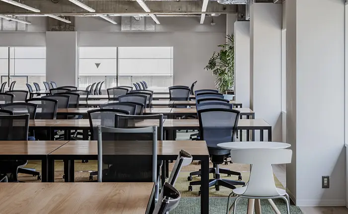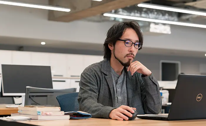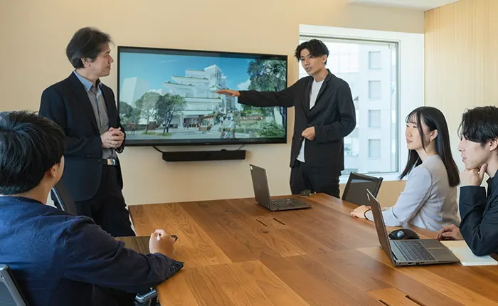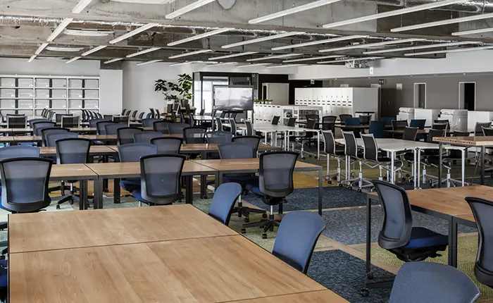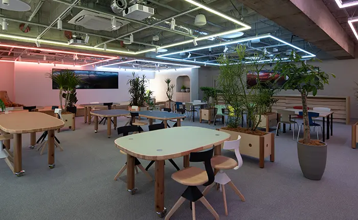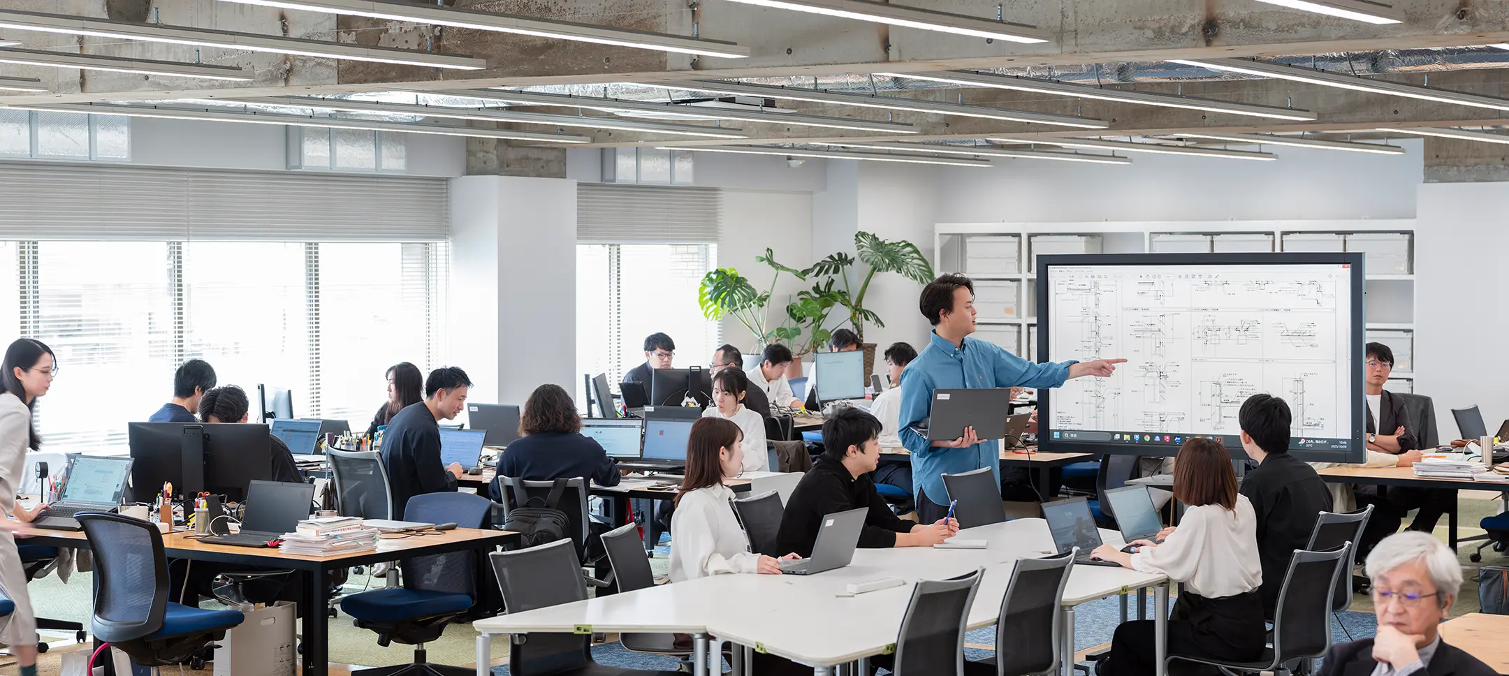 一人ひとりの学びと認識をアジリティに掛け合わせさらに深めていく、日々の生産活動の拠点です。ワンフロア内には、自然光に近い有機ELを採用。心地よいオフィス環境下で個々が自在に動き、互いに活発に意見を交わしています。