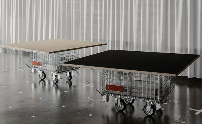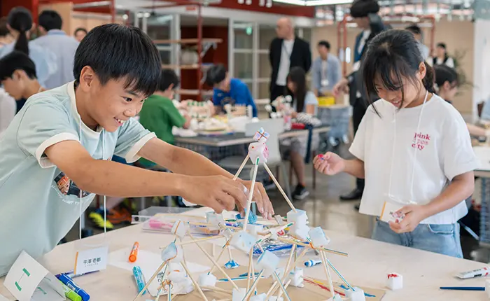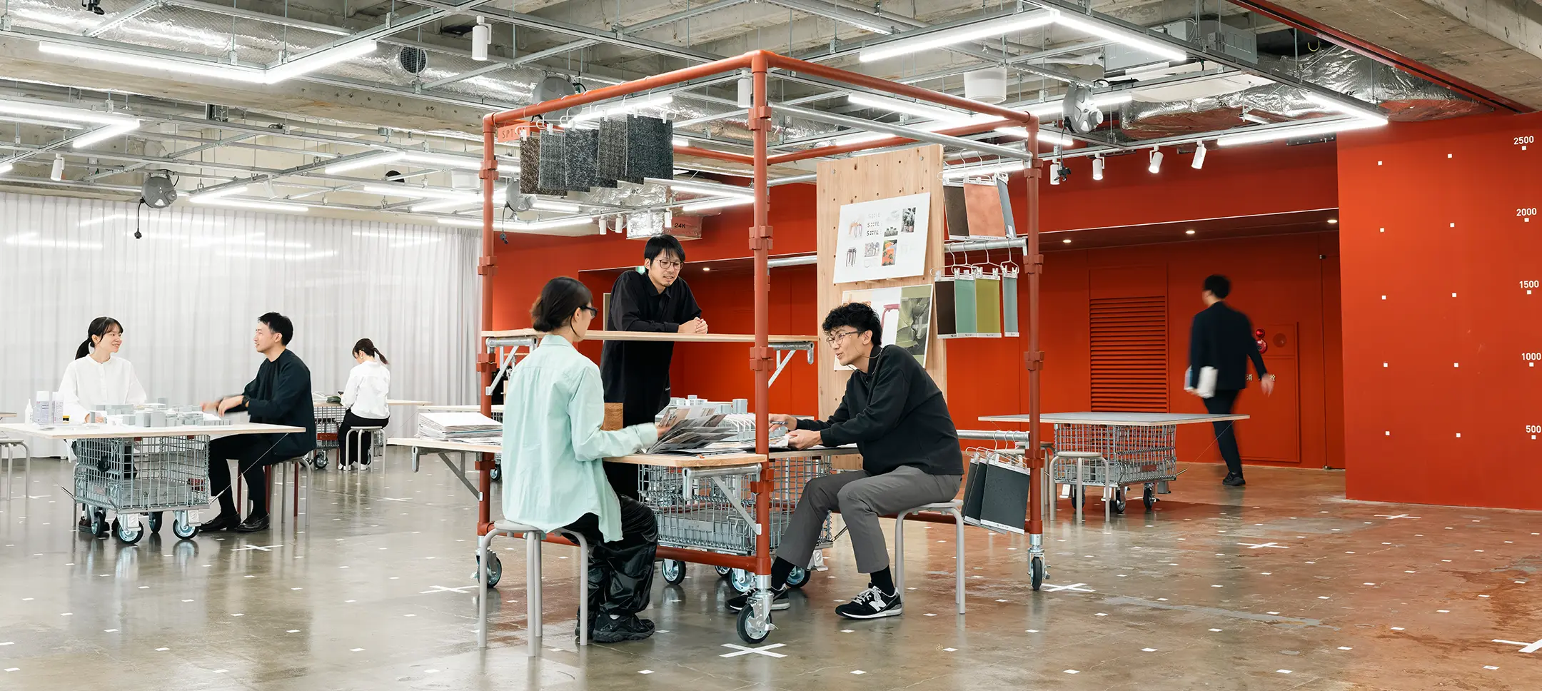 手を動かしながら、アイデアを練るモノづくりの拠点。直天井や塗り床などハードユースにも対応できるラフな仕様にするこで、試行錯誤を楽しめる空間に。仮設資材を活用した可動式の家具もすべてオリジナル。子育て中の社員が活用できる共同保育室も併設しています。
