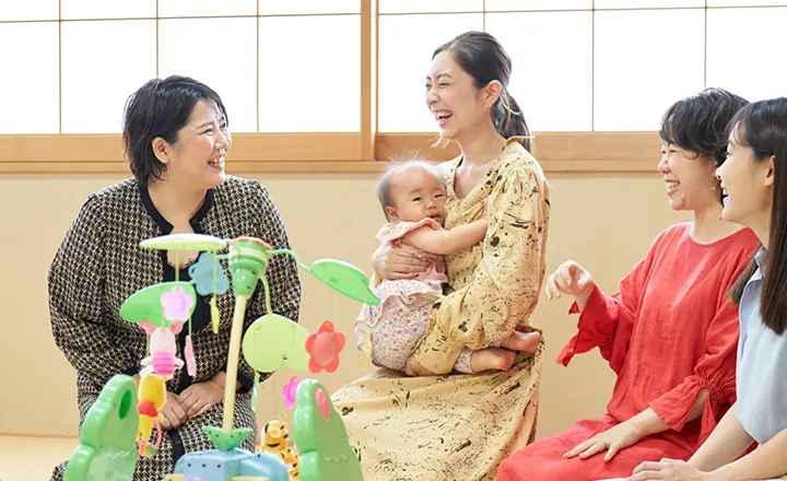 オフィスに併設された保育室は、十数年前に子育て世代社員3人が自ら立ち上げたもの。この制度は、女性だけでなく、男性社員からも働きやすいと好評です。